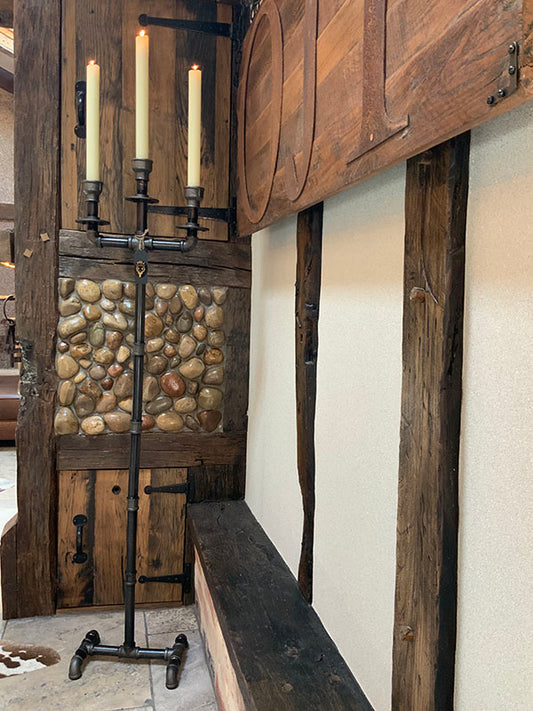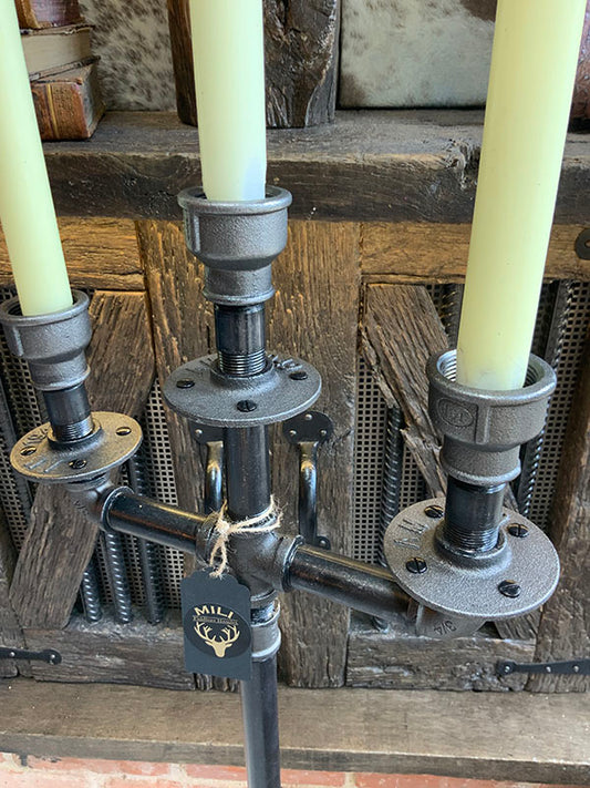 We have made this collection with pipe fittings with various different sizes of steel tubes and various different iron fittings to make our candle holders, and candelabras.